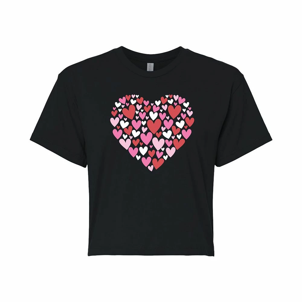 Look cute this Valentine’s Day in this heart filled juniors’ cropped graphic tee.