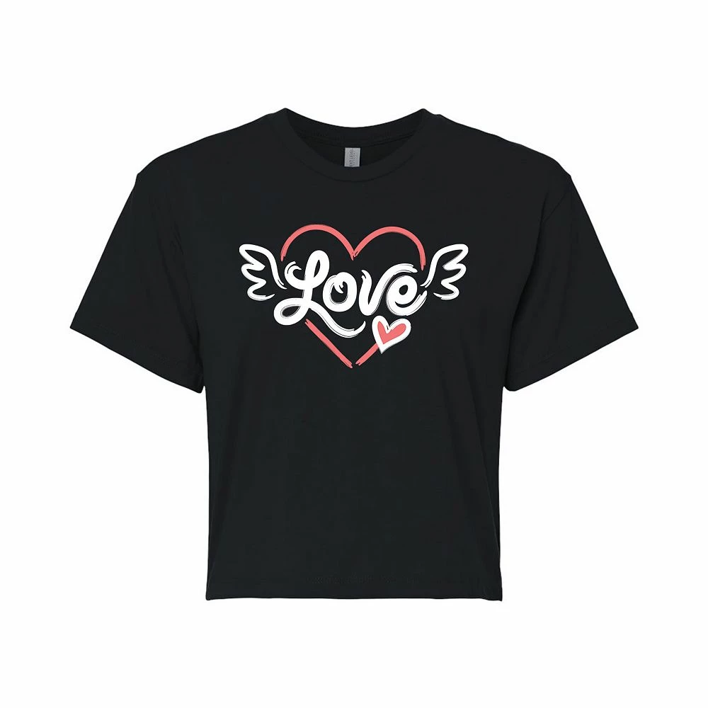 You’ll love this romantic Valentine’s Day winged “Love” juniors’ cropped graphic tee.