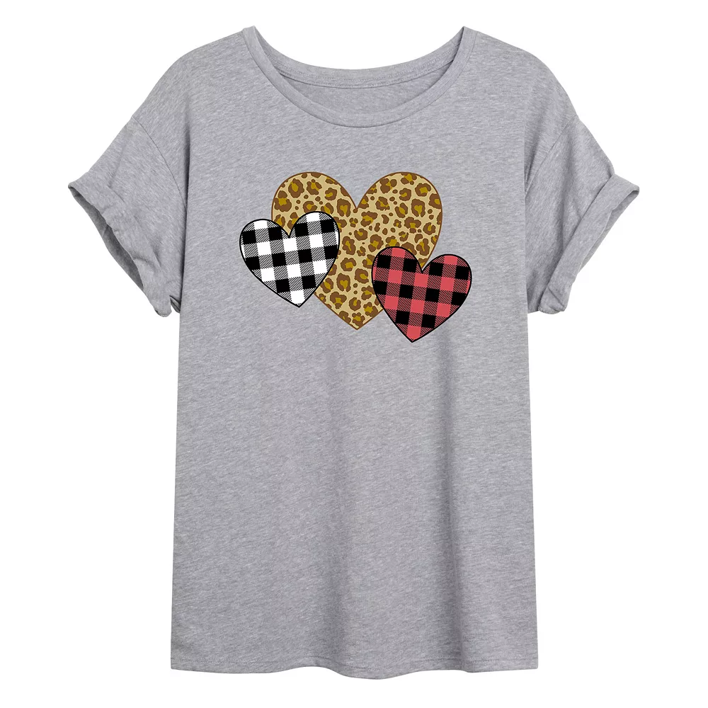Leopard and plaid prints come together for this juniors’ patterned hearts oversized graphic tee.