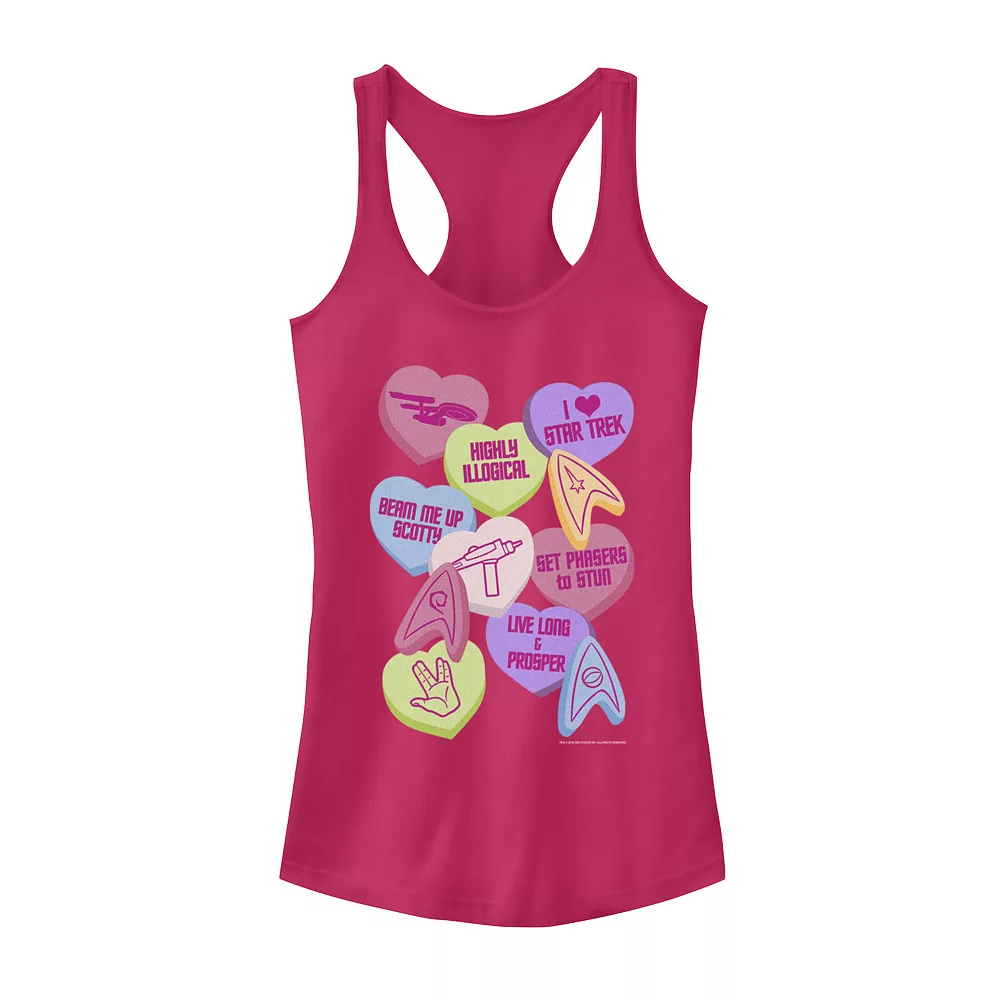 Enjoy this Juniors’ Star Trek Candy Hearts Valentine’s Day Tank Top, either for yourself or as a gift to your loved one on Valentine’s Day!