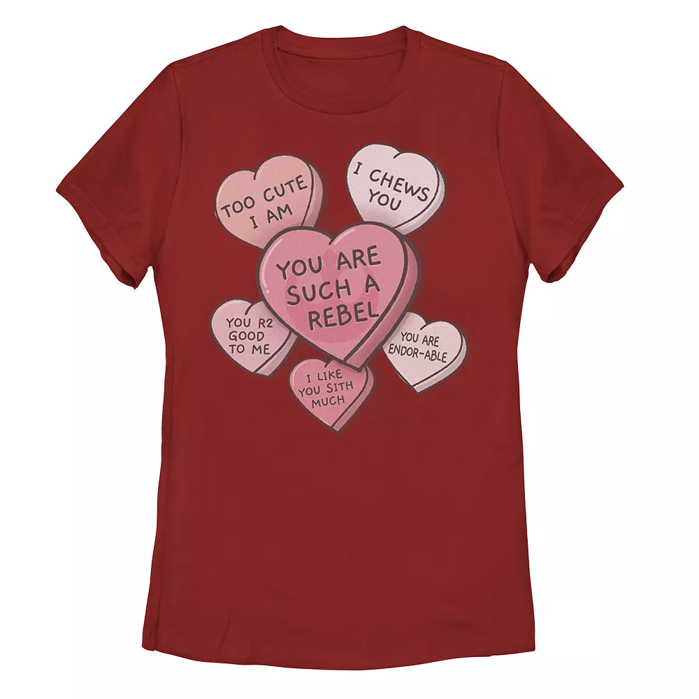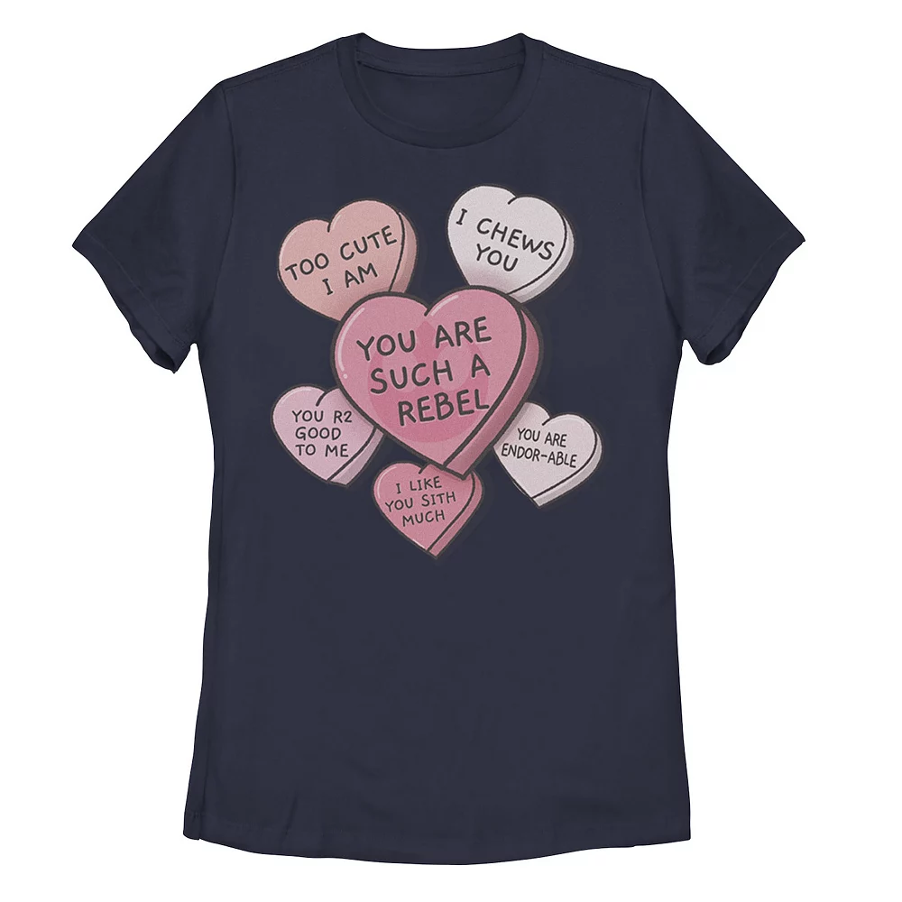 Star Wars themed candy hearts make this cute graphic tee the perfect choice for your sweetheart this Valentine’s Day.