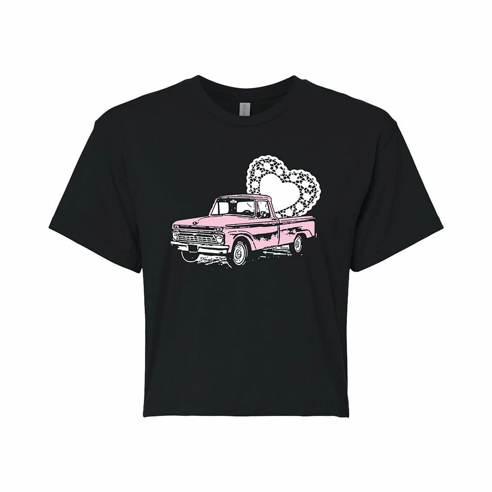 A lacy heart is in the back of the truck of this romantic juniors’ cropped graphic tee.