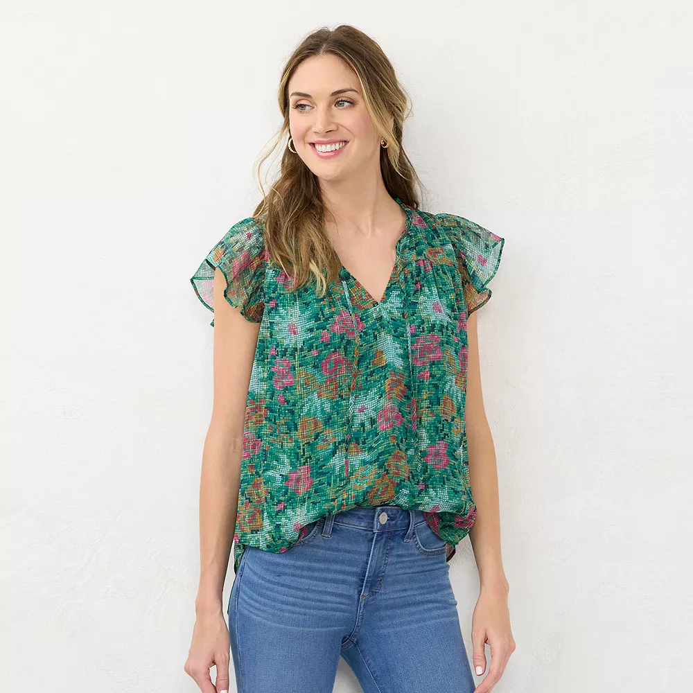 Ruffle details give this women’s LC Lauren Conrad V-neck top a chic, casual look.